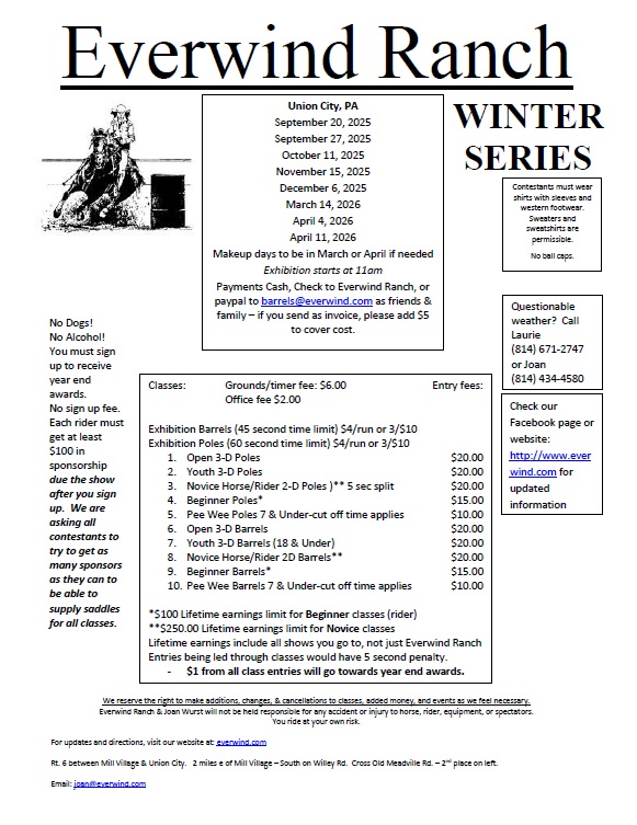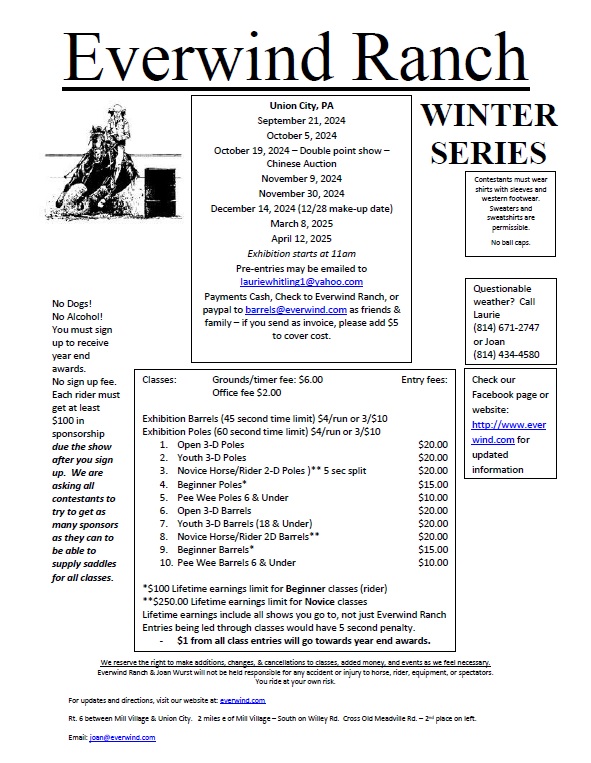 Pee Wee Barrels to run after Pee Wee Poles for the Series November 30th show postponed to December 28th, 2024 December 14th postponed October 19, 2024 - Double Point & Chinese Auction